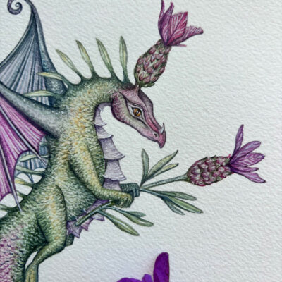 Painted on Arches cold pressed 300gsm watercolour paper, using professional watercolour paints. The paper is 23 x 31cm (9″ x 12″), with the illustration measuring approximately 17 x 15cm