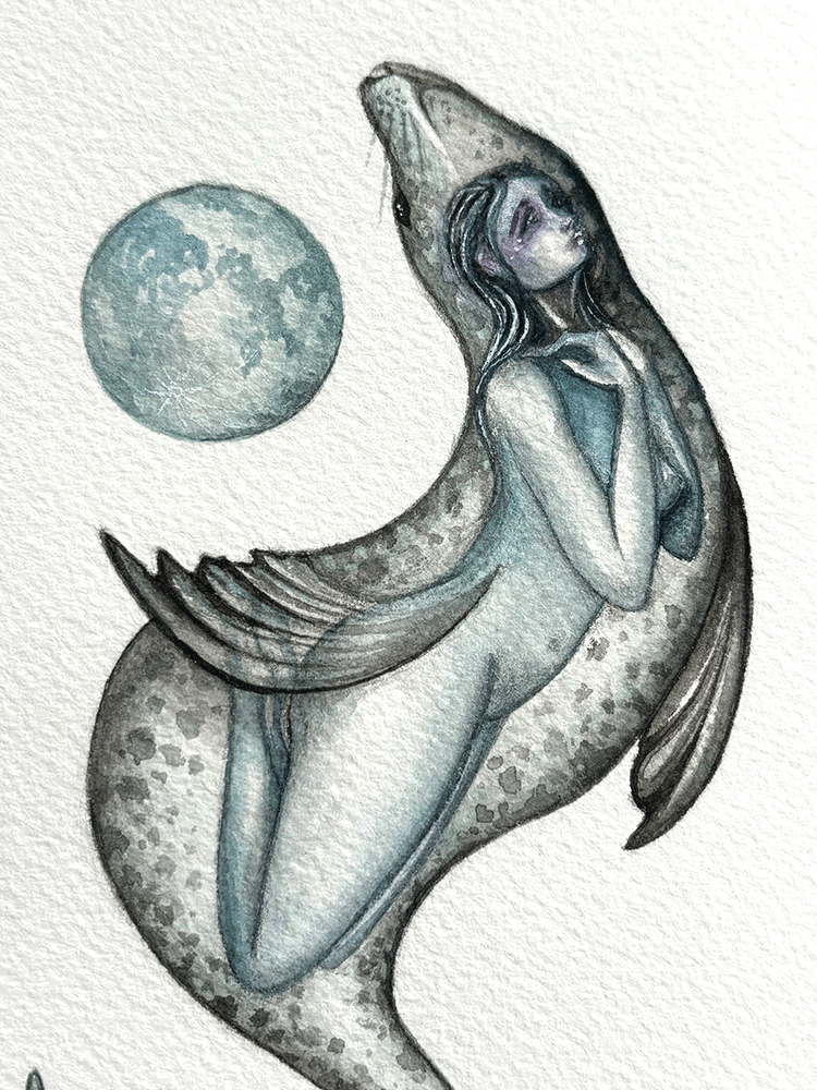 This particular Selkie has reclaimed her stolen skin and returned to her wild, watery home beneath the crashing waves, never to be tricked again. She will only ever answer the call of the moon.
