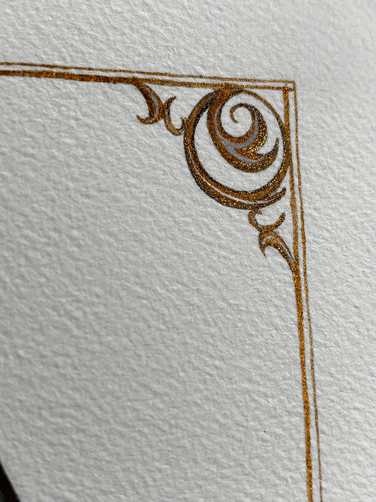 The Selkie and moon have been painted with professional watercolour paints, and the ornate border has been painted with varying shades of gold metallic paint.
